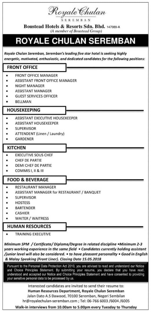 Jobsmalaysia Negeri Sembilan On Twitter Jawatan Kosong Di Royale Chulan Seremban Senawangtv Myneg9 Tuwitsomban Https T Co R8ipjay1u0 Twitter